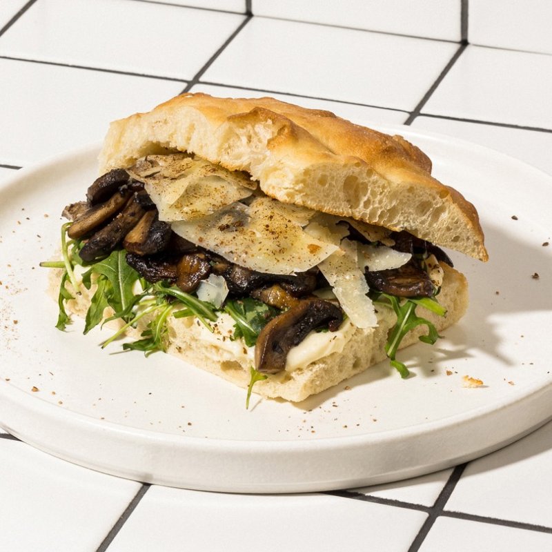 Focaccia με μανιτάρια, Κρέμα Παρμεζάνας, Πούδρα Porcini, Baby Ρόκα, Λάδι Τρούφας.