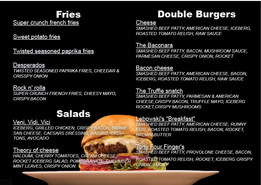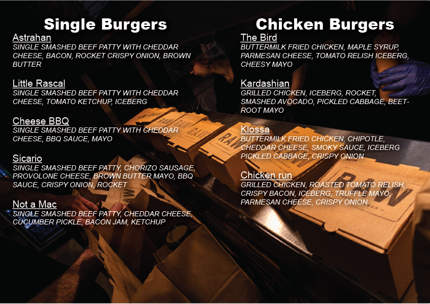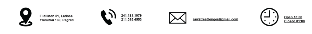 RAW-street burger- The Story 5 φίλοι, μια ιδέα και η αγάπη για καλό burger έφεραν στη Λάρισα τον Απρίλιο του 2022 το RAW Street Burger. Ένα χρόνο μετά και στην Αθήνα! Έναν χρόνο αργότερα και στη Θεσσαλονίκη OUR MENU